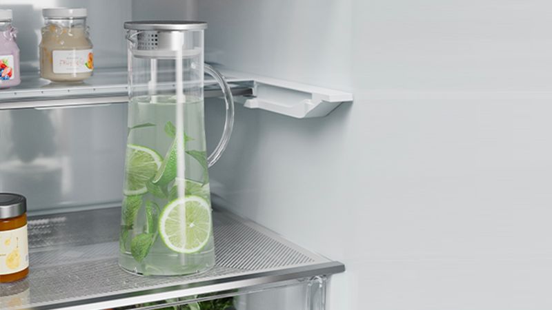 Prispôsobte si vnútorný priestor vašej chladničky vďaka Flexi sklenenej poličke, ktorá sa ľahko zasunie a tým sa zmenší na polovicu. Skladujte vďaka tomu pohodlne napríklad vysoké krčahy alebo misu so šalátom.