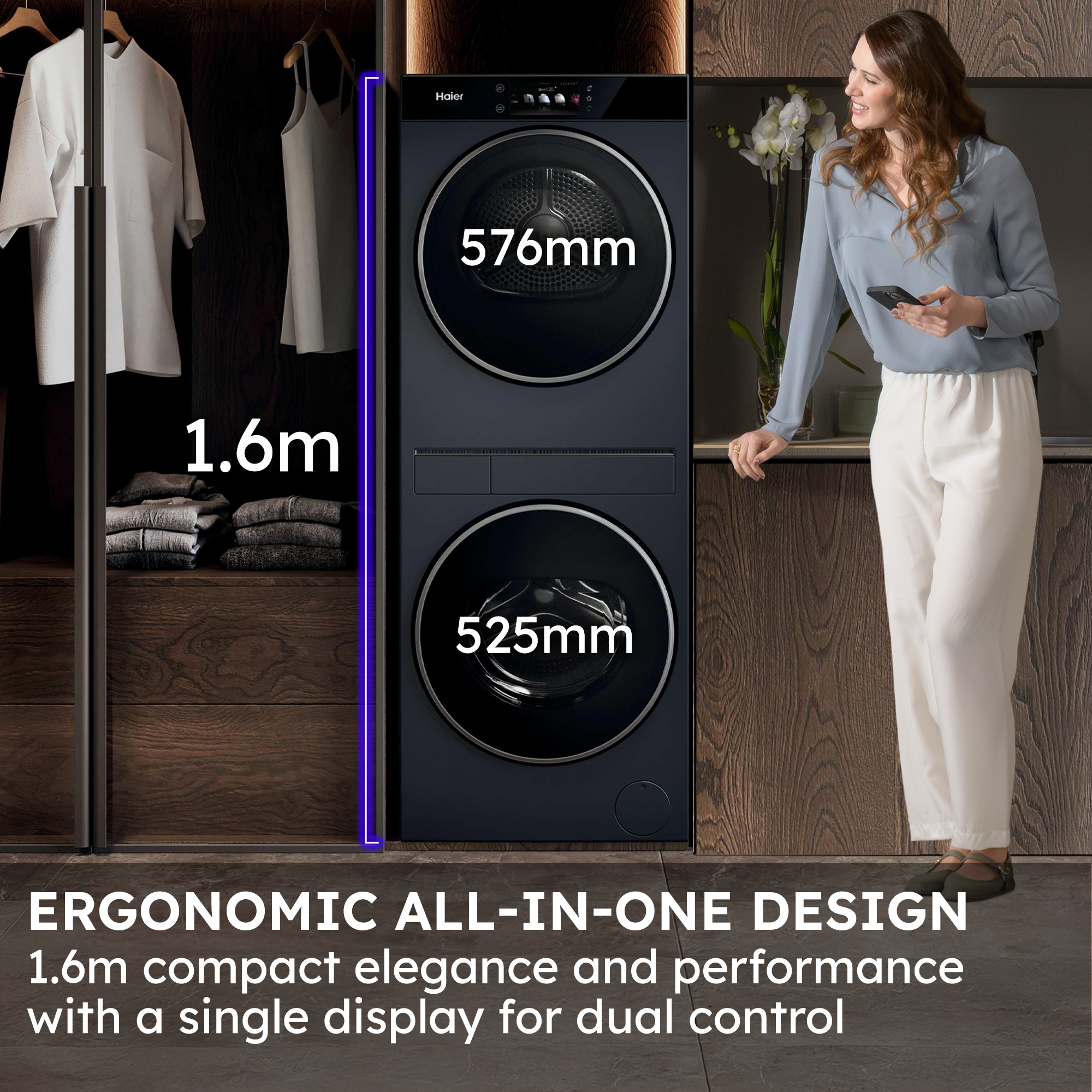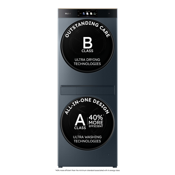 - Two appliances, one space: Compact 1.60m washer-dryer tower with a single, ergonomic control display.