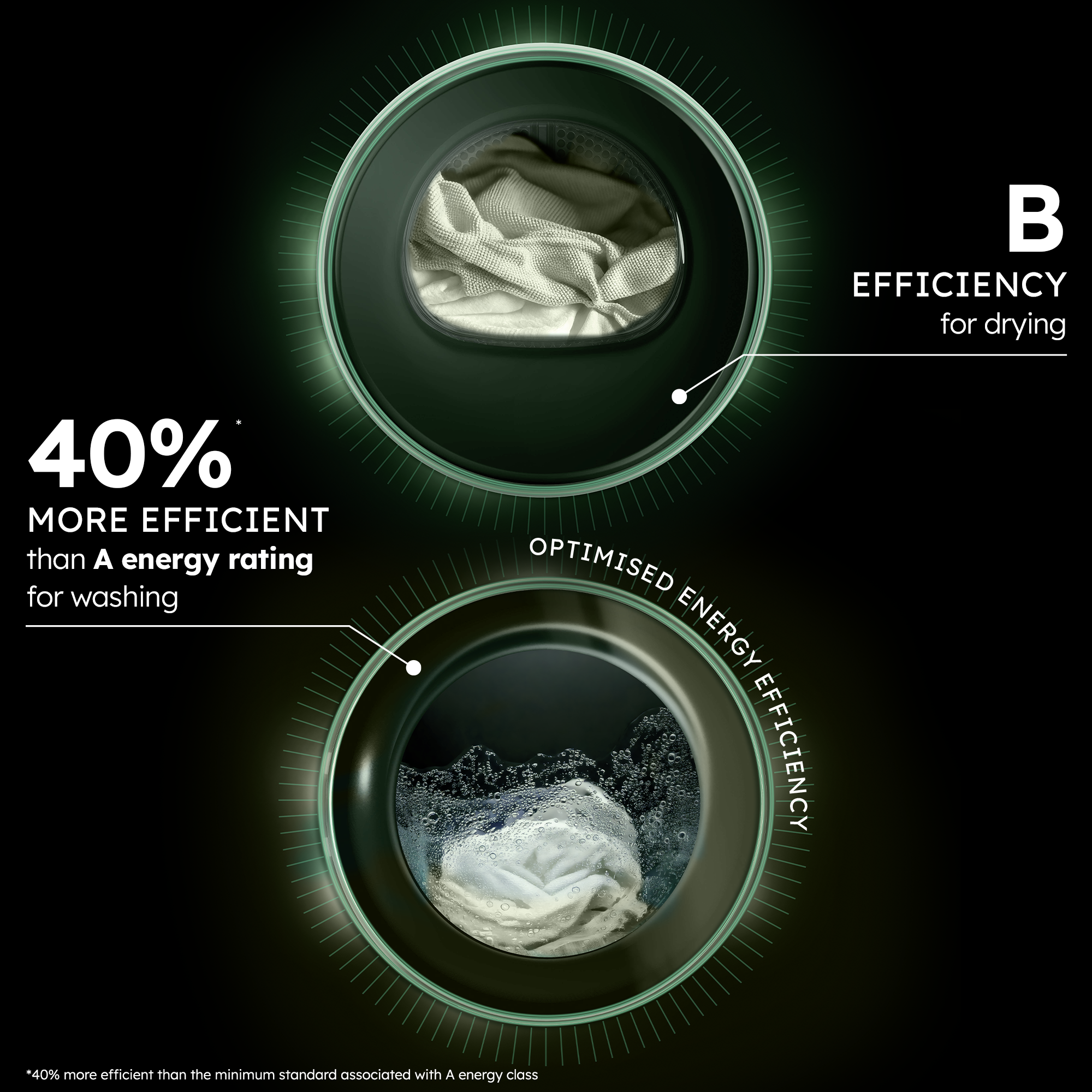 - High efficiency, low impact: Heat Pump technology delivers A-20% washing and B-rated drying efficiency.