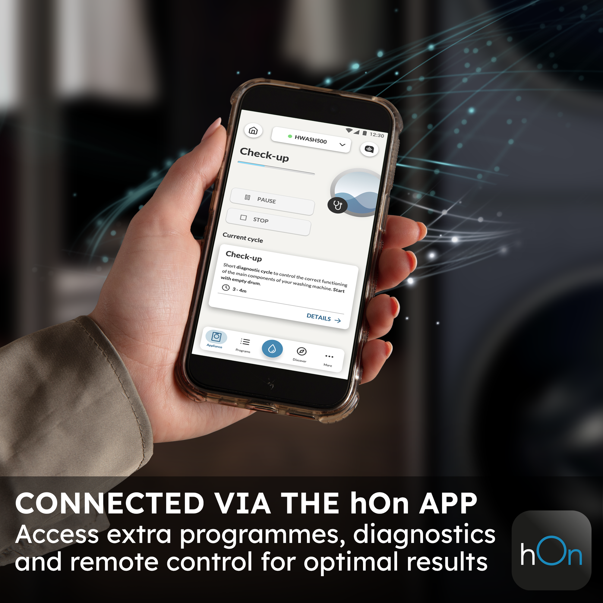 Smart control with hOn App: Manage cycles, customise programmes and get updates remotely.
