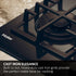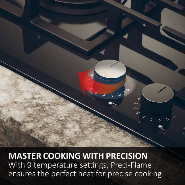 Haier Gas On Glass Series 4 Gas on Glass Hob - Black - 5 Rings combines sleek glass and black cast iron for a minimalist, elegant kitchen look. Premium knobs and a dark-glass surface enhance its sophistication, while Preci Flame offers 9 precise heat settings per flame, including a powerful large burner for optimized performance