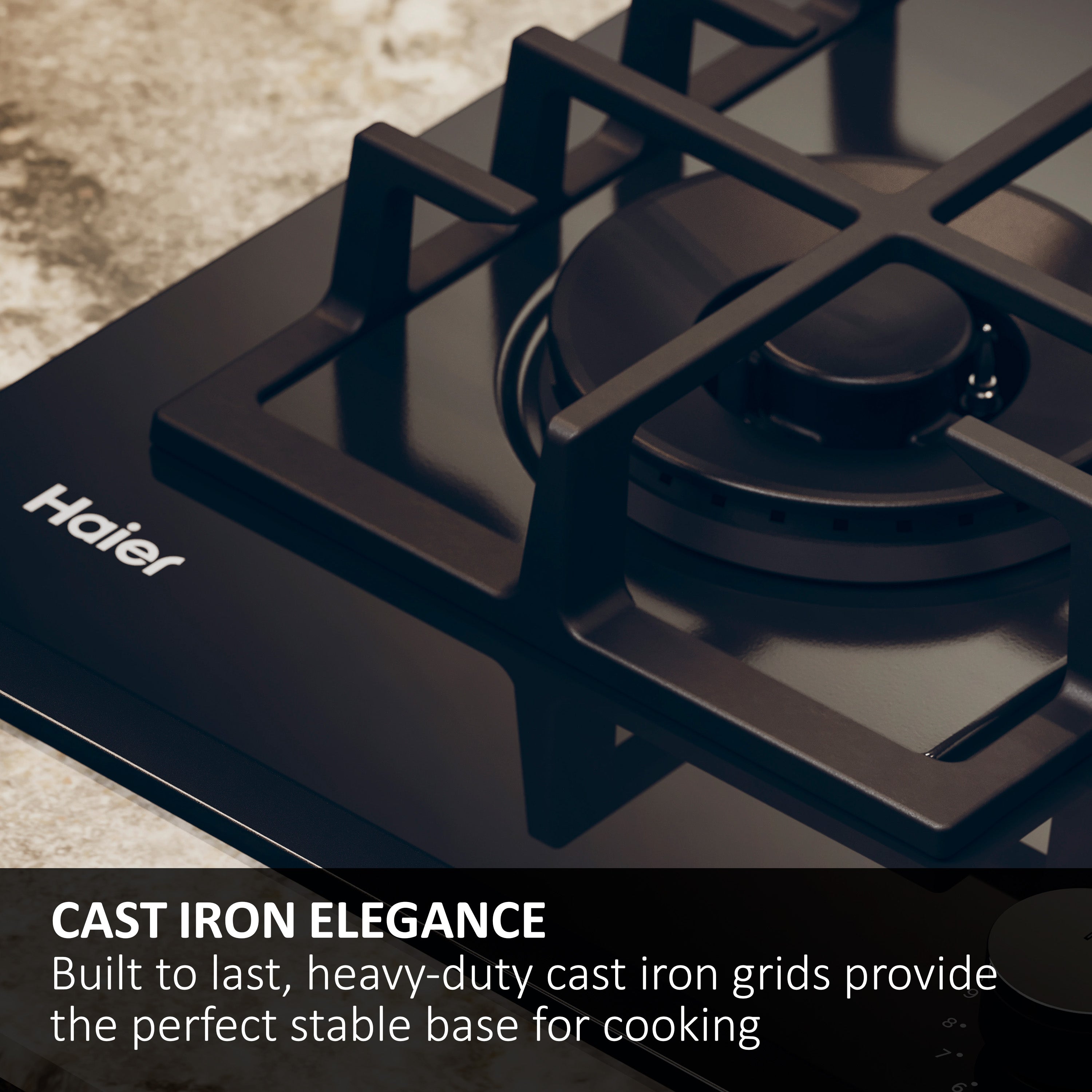 Haier Gas On Glass Series 4 Gas on Glass Hob - Black - 4 Rings combines elegant glass and black cast iron for a minimalist kitchen look. Premium knobs and a sleek dark-glass surface enhance its sophisticated style, while Preci Flame delivers 9 precise heat settings per flame, including a powerful large burner for optimal performance.
