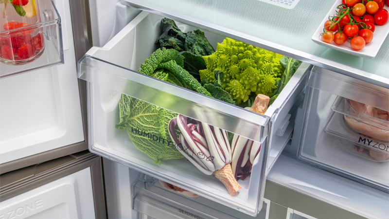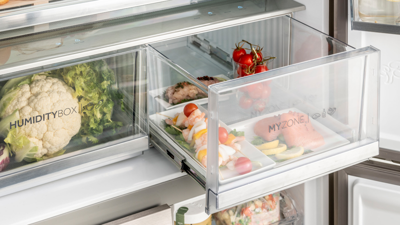 Haier’s practical Humidity Zone* keeps your fruit and vegetables fresher two times longer**. This is thanks to HCS (Humidity Control System) Technology, a plant fibre membrane that keeps moisture levels at the optimum 90%, while preventing water from condensing inside the drawer, preserving your food more effectively. Cool is also still able to circulate in the drawer, so groceries are preserved for longer while maintaining their nutritional content.