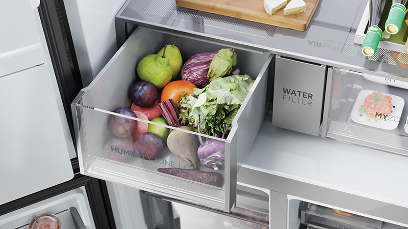 El cajón Humidity Zone mantiene tus frutas y verduras más frescas, durante el doble de tiempo*, gracias a la innovadora tecnología del Sistema de Control de Humedad que mantiene la humedad al 90%. También evita la formación de condensación, manteniendo inalterados todos los nutrientes de los alimentos por más tiempo.