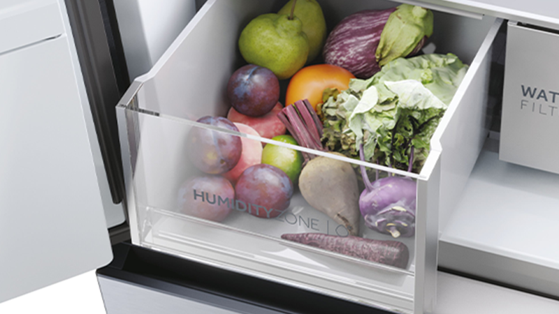 La Humidity Zone maintient un taux d'humidité de 90 % à l'intérieur du compartiment, ce qui préserve le contenu nutritionnel de vos aliments et leur permet de rester frais deux fois plus longtemps*.