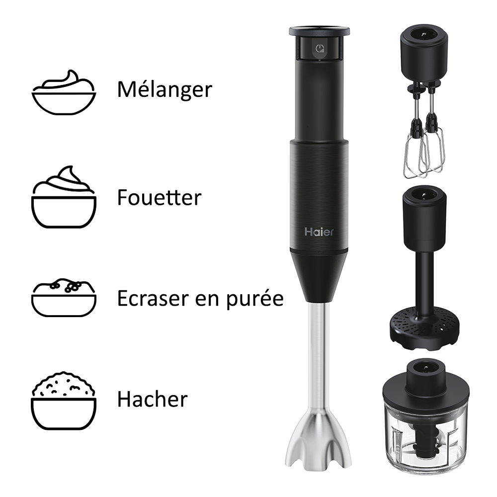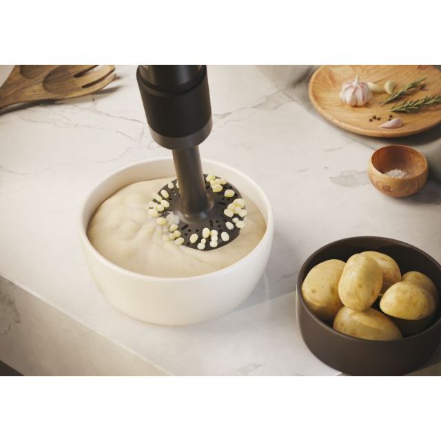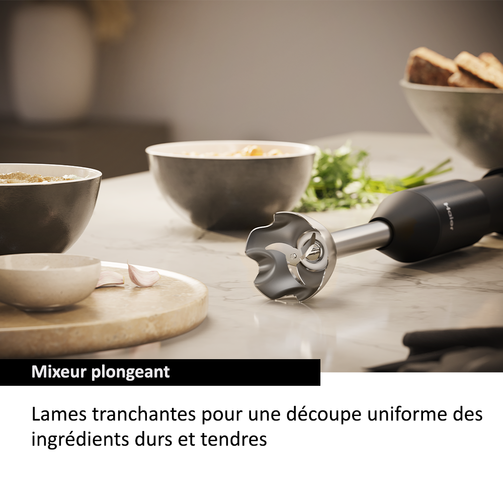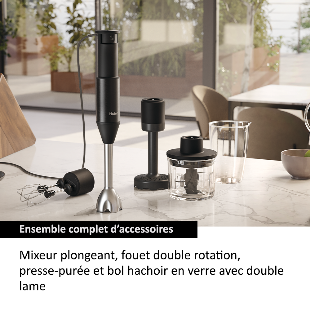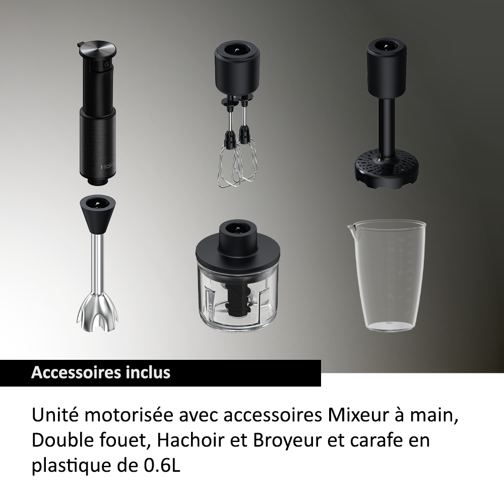 - 5 accessoires inclus : presse-purée, mixeur plongeant, bol hachoir, fouet, bol gradué.
