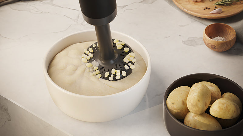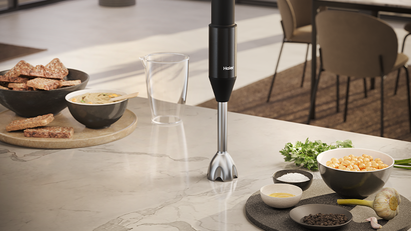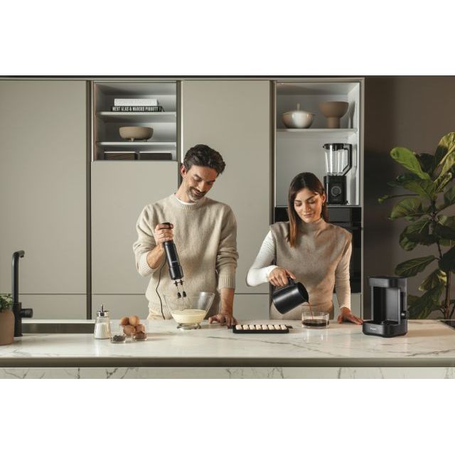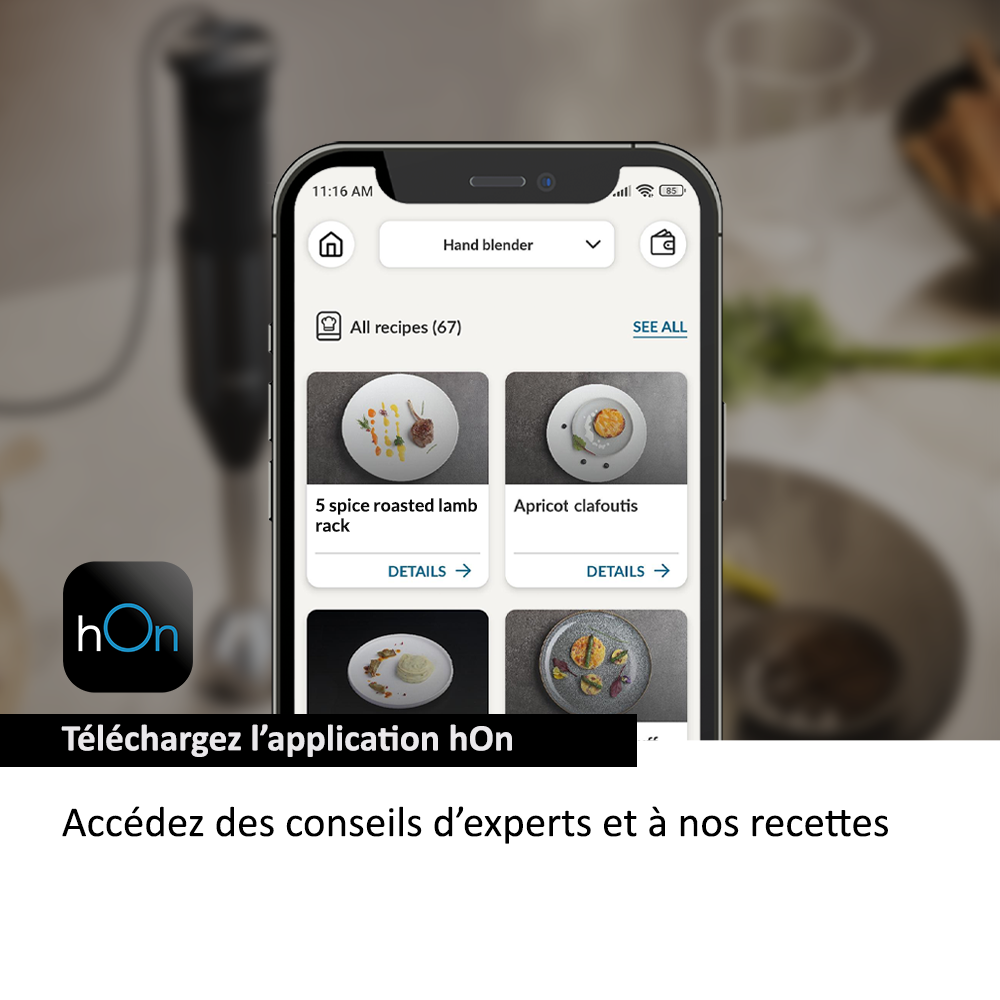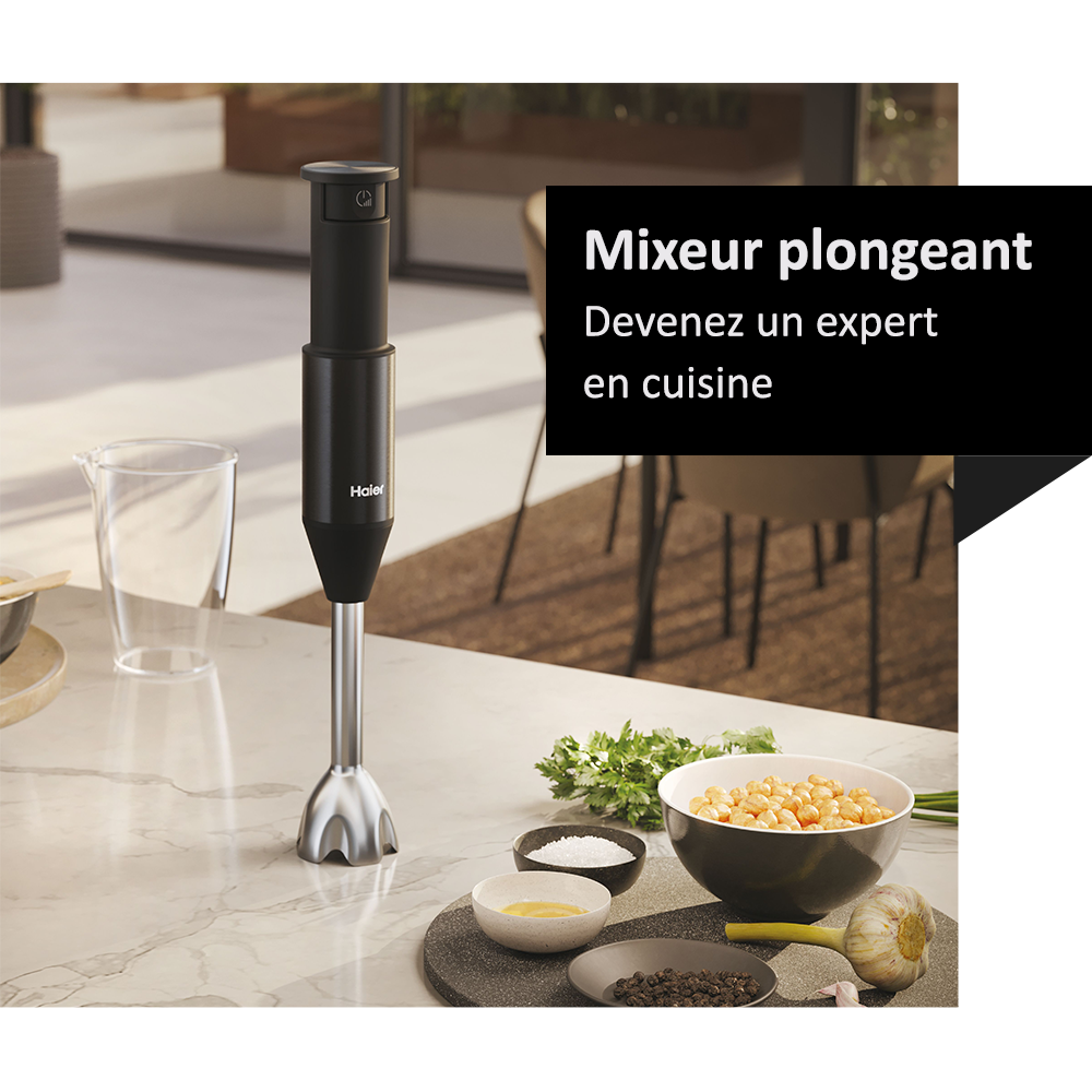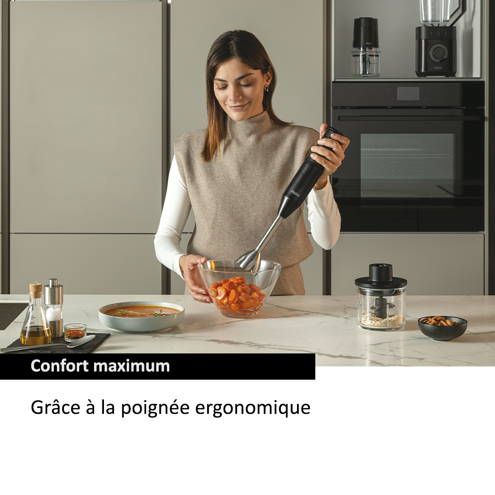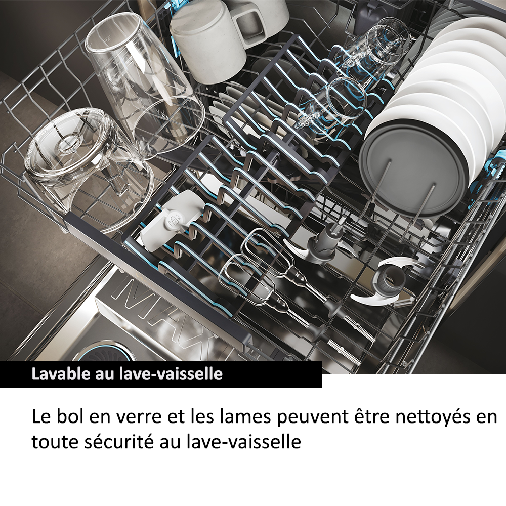 - 5 accessoires inclus : presse-purée, mixeur plongeant, bol hachoir, fouet, bol gradué.