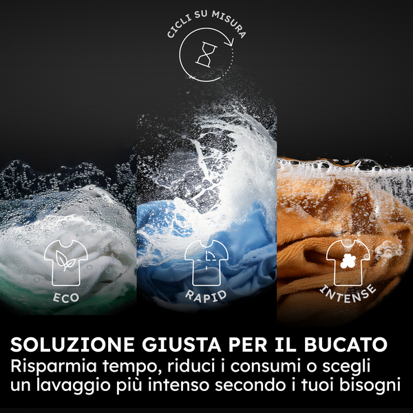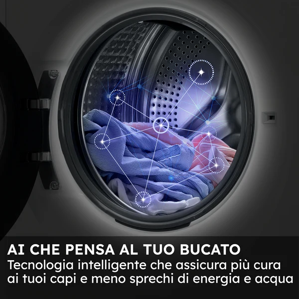 - Extra flessibilità: scegli tra lavaggi Rapido, Eco o Intensivo, oppure lascia che sia l’AI a impostare il ciclo migliore per te