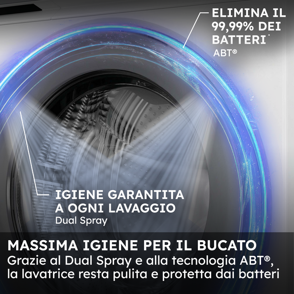 - Igiene quotidiana: tecnologia antibatterica ABT® e sistema Smart Dual Spray che mantiene la lavatrice sempre pulita