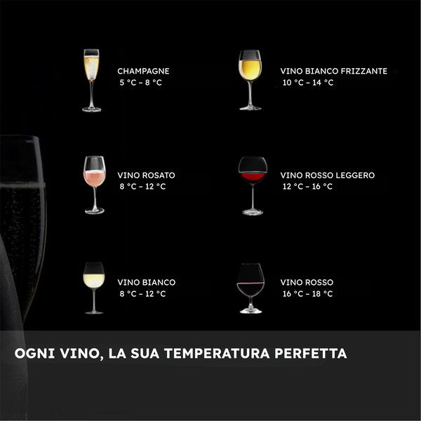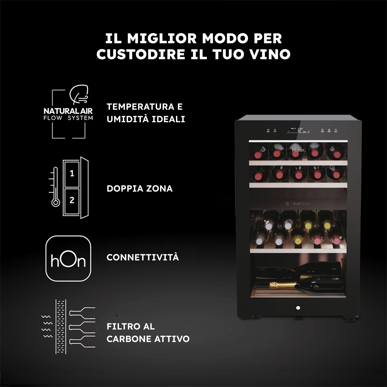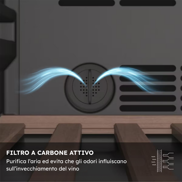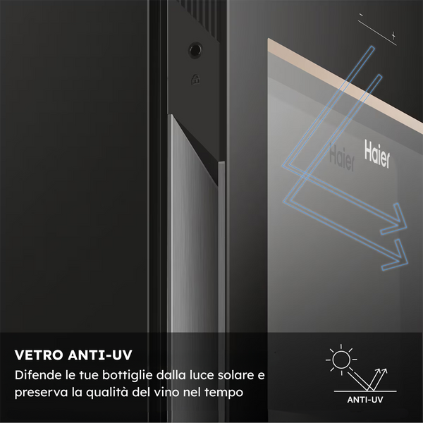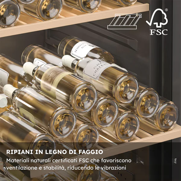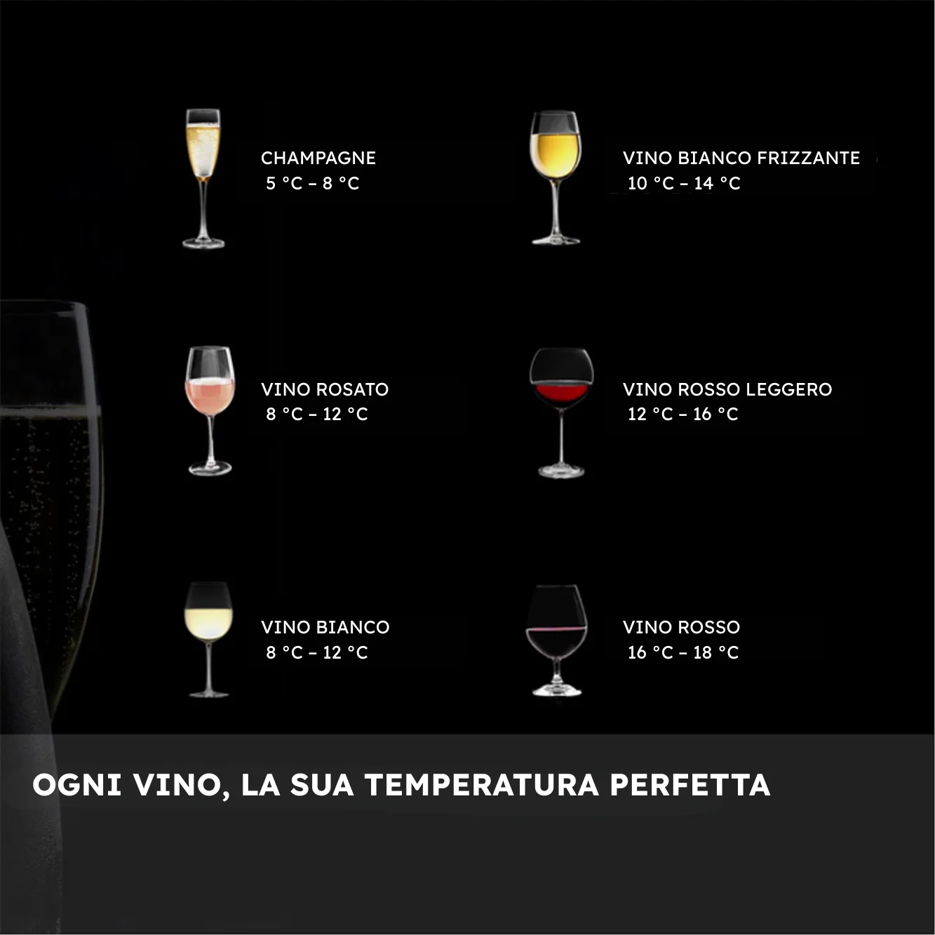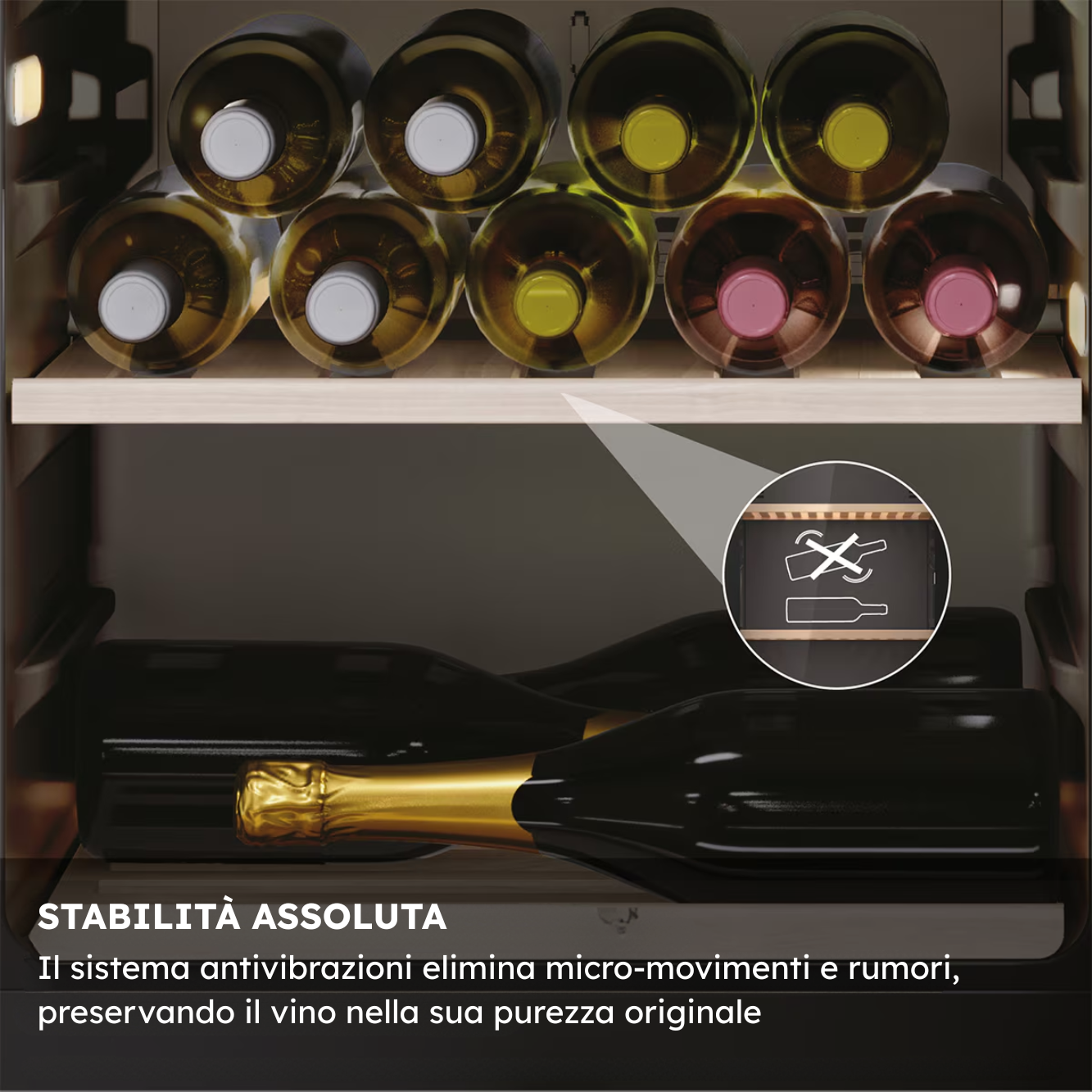 - Protezione del vino: porta anti-UV, filtro ai carboni attivi e compressore anti-vibrazioni per preservare aromi e gusto