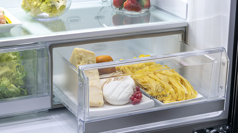 „Dry Zone“ – puiki vieta mėsai, žuviai, pieno produktams ar skanėstams laikyti. Dėl „Fresher Techs®“ technologijos kameros drėgmės lygis išlieka mažesnis kaip 45 %, taip užtikrinant optimalias sąlygas ilgesniam šio tipo maisto produktų laikymui.