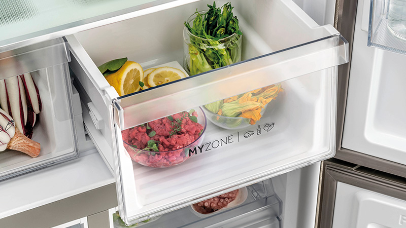Met gemak en snelheid kun je de temperatuur van de compartimenten aanpassen met vijf verschillende instellingen, variërend van -3°C tot +5°C, afhankelijk van de voedingsmiddelen die je wilt bewaren. Kies uit opties zoals Fruits & Vegetables, Seafood, Defrost, Quickcool of Chiller 0°C Fresh. Een praktische, efficiënte en volledig gepersonaliseerde ervaring.
