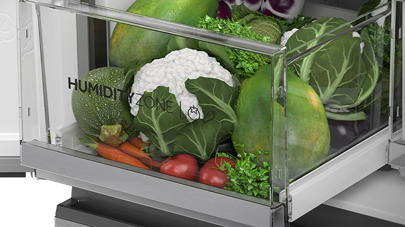Ontdek de Humidity Zone in je Haier-koelkast, waar de luchtvochtigheid op een ideale 90% wordt gehouden voor groenten en fruit. Terwijl de koude lucht blijft circuleren, biedt deze geavanceerde conserveringstechnologie niet alleen een langere bewaartijd voor je boodschappen, maar behoudt het ook de voedingswaarde ervan.
