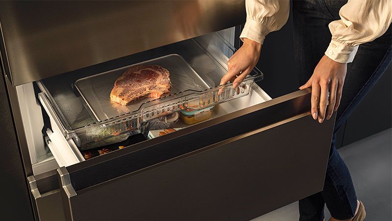 Met gemak en snelheid kun je de temperatuur van de compartimenten aanpassen met vijf verschillende instellingen, variërend van -3°C tot +5°C, afhankelijk van de voedingsmiddelen die je wilt bewaren. Kies uit opties zoals Fruits & Vegetables, Seafood, Defrost, Quickcool of Chiller 0°C Fresh. Een praktische, efficiënte en volledig gepersonaliseerde ervaring.