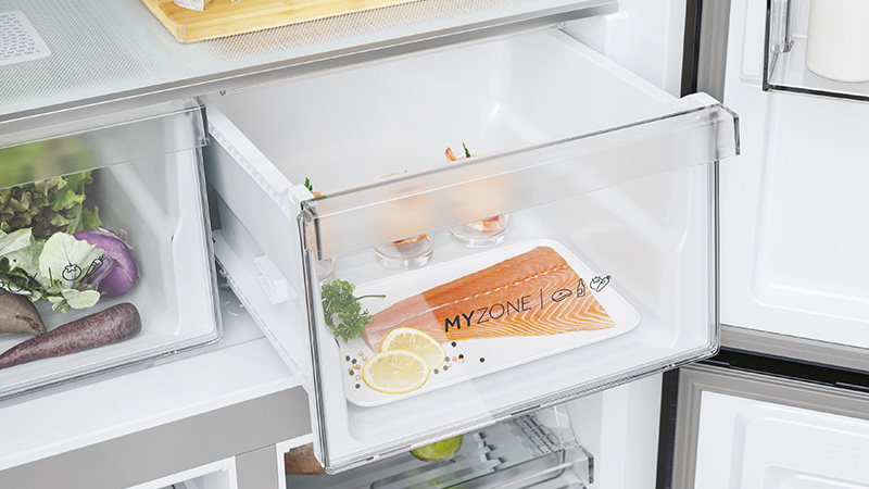Zaawansowana technologicznie szuflada My Zone pozwala za jednym dotknięciem na łatwe dopasowanie temperatury w zależności od rodzaju przechowywanych produktów. Oferuje trzy tryby ustawień: Strefa Fresh (od 0°C do 1°C), Szybkie Schładzanie (od 2°C do 3°C) oraz Owoce i Warzywa (od 4°C do 5°C). Dzięki tym opcjom można zapewnić optymalne warunki do przechowywania owoców i warzyw, mięsa, serów, produktów do rozmrożenia, owoców morza oraz artykułów wymagających szybkiego schłodzenia.