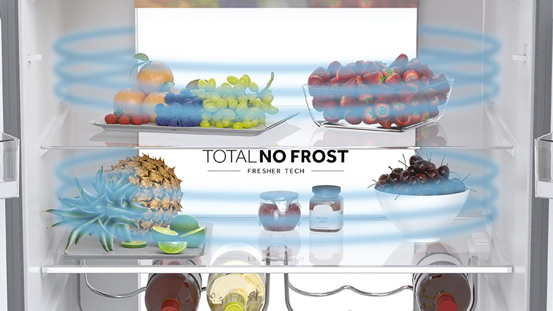 Technologia Total No Frost w lodówkach Haier całkowicie eliminuje problem osadzania się szronu, zapewniając wygodę i komfort użytkowania. Specjalna osłona skutecznie chroni zamrożoną żywność przed dostępem ciepłego powietrza podczas odszraniania, zapobiegając jednocześnie mieszaniu się zapachów.