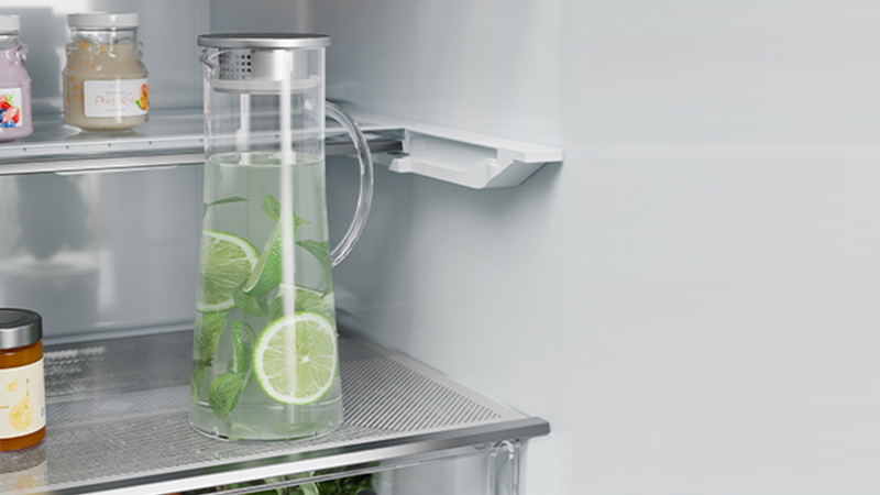 Prispôsobte si vnútorný priestor vašej chladničky vďaka Flexi sklenenej poličke, ktorá sa ľahko zasunie a tým sa zmenší na polovicu. Skladujte vďaka tomu pohodlne napríklad vysoké krčahy alebo misu so šalátom.
