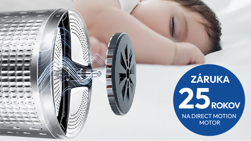 Direct Motion je náš najtichší a zároveň najefektívnejší motor pri vybraných práčkach a práčkach so sušičkou. Je umiestnený priamo na osi bubna, preto aj pri odstreďovaní znižuje vibrácie na minimum a spotrebič takmer nepočujete. Záruka 25 rokov zadarmo potvrdzuje, že si za jeho kvalitou naozaj stojíme. Na získanie záruky je potrebné registrovať svoj nový produkt do 14 dní od nákupu na www.registracia-zaruka.sk, kde tiež nájdete aktuálny zoznam výrobkov zaradených do tejto akcie a jej pravidlá.