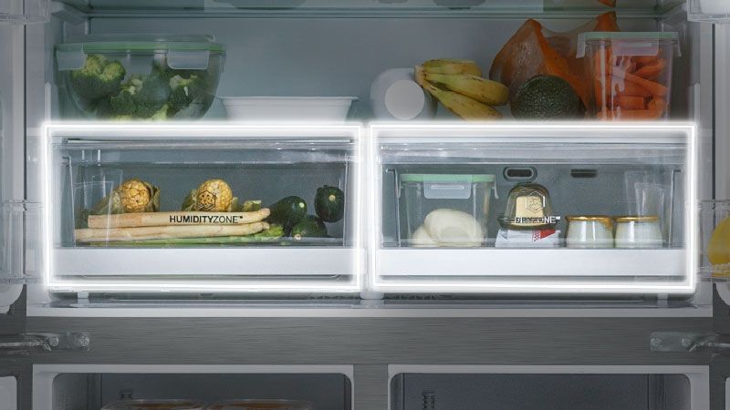 Frižideri serije Cube su opremljeni sa dve specijalizovane fioke; Humidity Zone (održava visok nivo vlažnosti na 90%), i Dry Zone (nivo vlažnosti ispod 45%).< 45%). Koristite Humidity zonu kako bi čuvali sveže namirnice poput voća i povrća, dok je Dry zona idealna za delikates hranu poput suhomesnatih proizvoda i sireva.